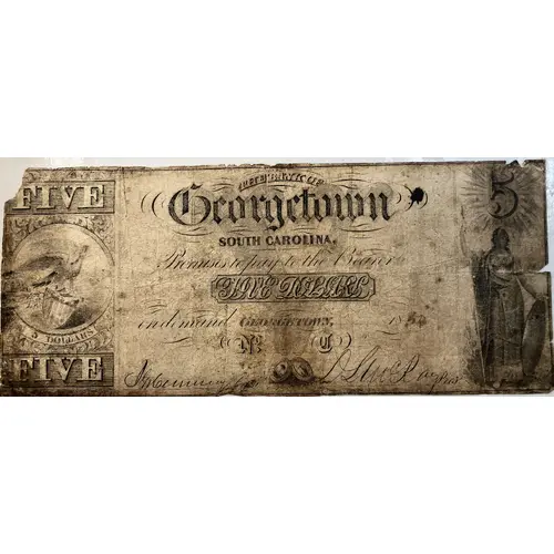 | Obverse lettering | The Bank of GEORGETOWN South Carolina, Promises to pay the bearer FIVE DOLLARS on demand GEORGETOWN, 1854 |