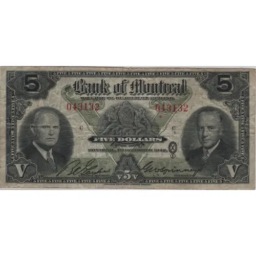 5 BANK OF MONTREAL 5 WILL PAY TO BEARER ON DEMAND FIVE DOLLARS MONTREAL, 7TH DECEMBER 1942 GENERAL MANAGER PRESIDENT V V5V V CANADIAN BANK NOTE COMPANY, LIMITED |