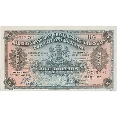 Obverse lettering BARCLAYS BANK (DOMINION, COLONIAL AND OVERSEAS) INCORPORATED BY ROYAL CHARTER 1836 REINCORPORATED BY ACT OF PARLIAMENT 1925 FORMERLY THE COLONIAL BANK PROMISE TO PAY THE BARER ON DEMAND AT ITS OFFICE HERE FIVE DOLLARS IN LOCAL CURRENCY FIVE DOLLARS DEMERARA BRITISH GUIANA