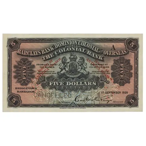 BARCLAYS BANK (DOMINION, COLONIAL AND OVERSEAS) FORMERLY THE COLONIAL BANK PROMISES TO PAY THE BARER ON DEMAND AT ITS OFFICE HERE ISSUED AT ANTIGUA BRANCH FIVE DOLLARS BRIDGETOWN BARBADOS |
