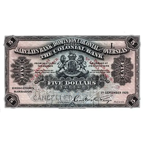 BARCLAYS BANK (DOMINION, COLONIAL AND OVERSEAS) FORMERLY THE COLONIAL BANK PROMISES TO PAY THE BARER ON DEMAND AT ITS OFFICE HERE ISSUED AT ST. LUCIA BRANCH FIVE DOLLARS BRIDGETOWN BARBADOS |
