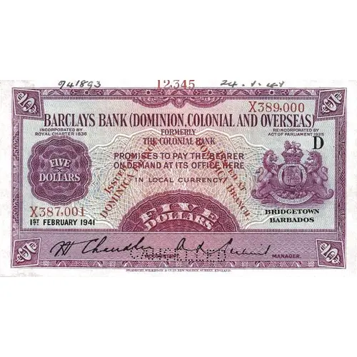 | Obverse description | Blue on green and purple underprint. Branch of issue printed `ISSUED AT DOMINICA BRANCH` in red at an angle on left and right sides on a standard banknote design used for all of Barclay`s colonial note issues. Capital letter D in field on top left. Supported royal arms at centre. |