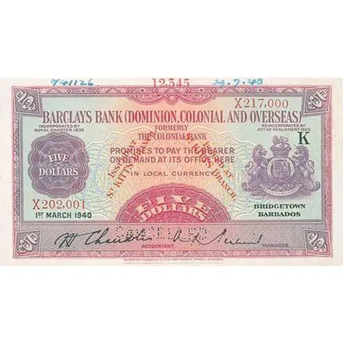 Purple on blue and orange underprint. Supported royal arms at centre. Branch of issue printed `ISSUED AT ST. KITTS BRANCH` in red at an angle on left and right sides on a standard banknote design used for all of Barclay`s colonial note issues. Prefix of single letter plus a serial number up to six digits on top right and bottom left. Date of issue in black on bottom left. Head office ‘Bridgetown Barbados’ in black on bottom right. Capital letter K in field on top right. Manuscript signature, on bottom left of ACCOUNTANT and printed signature on bottom right of MANAGER. |