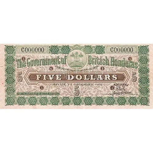 Green and brown print; black serial numbers. Coat of arms of British Honduras at top. |