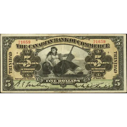 | Obverse lettering | THE CANADIAN BANK OF COMMERCE WILL PAY TO THE BEARER ON DEMAND FIVE DOLLARS IN TRINIDAD CURRENCY TRINIDAD |
