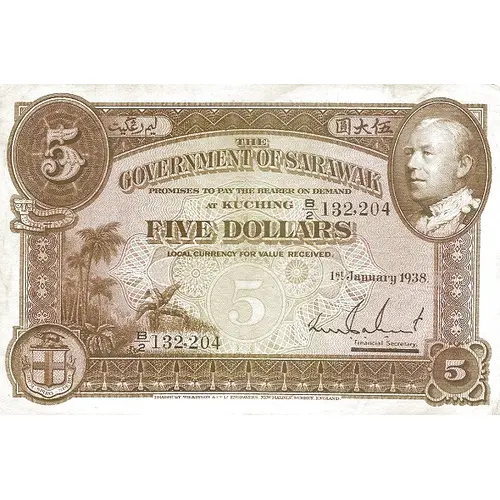| 表面の銘文 | THE GOVERNMENT OF SARAWAK PROMISE TOPAY THE BEARER ON DEMAND AT KUCHING FIVE DOLLARS LOCAL CURRENCY FOR VALUE RECEIVED |