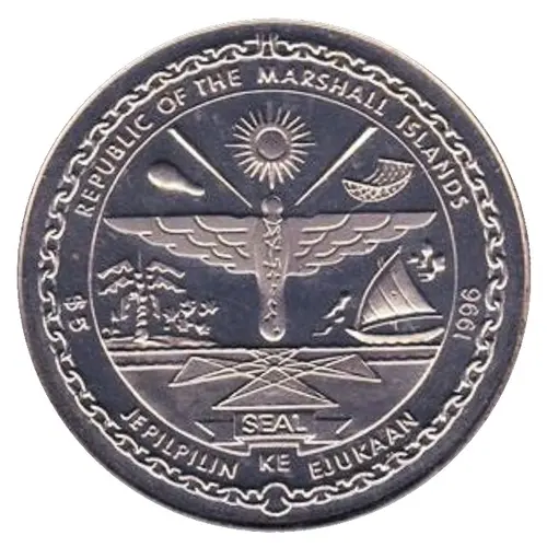 | Obverse lettering | REPUBLIC OF THE MARSHALL ISLANDS $5 1996 JEPILPILIN KE EJUKAAN (Translation: Accomplishment Through Joint Effort) |