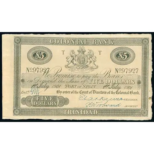 | Obverse lettering | COLONIAL BANK WE PROMISE TO PAY THE BEARER ON DEMAND THE SUM OF FIVE DOLLARS PORT OF SPAIN BY ORDER OF THE COURT OF DIRECTORS OF THE COLONIAL BANK FIVE TRINIDAD |