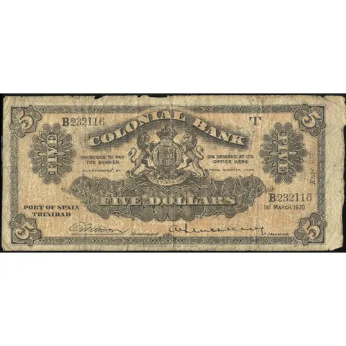 | Obverse lettering | COLONIAL BANK PROMISE TO PAY THE BEARER ON DEMAND AT ITS OFFICE HERE INCORPORATED BY ROYAL CHARTER 1836 FIVE DOLLARS PORT OF SPAIN TRINIDAD |