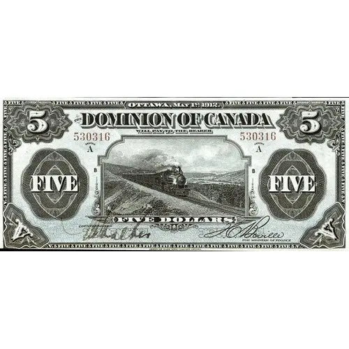 | Obverse lettering | Ottawa, May 1st. 1912. The Dominion of Canada will pay to the bearer Five Dollars |