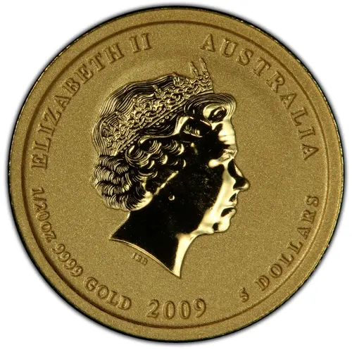 | Obverse lettering | ELIZABETH II AUSTRALIA IRB 1/20oz 9999 GOLD 2009 5 DOLLARS |