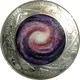 Colored depiction of our galaxy - The Milky Way. On the non-colored outer ring are images of an astronomer, radio-telescope, rocket ship , stars and planets of our solar system. This side is convex. |