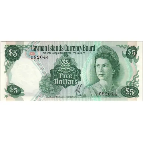 $5 Cayman Islands Currency Board $5 This note is legal tender for Five Dollar HE HATH FOUNDED IT UPON THE SEAS Five Dollar Chairman Issued under the Cayman Islands Currency Law, 1971 |