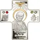 Effigy of pope John Paul II facing, coat of arms of Poland to the left and coat of arms of Vatican City to the right. Peace dove above. |