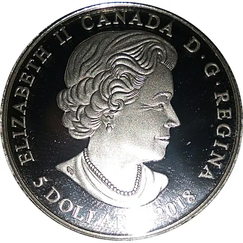 | Obverse lettering | ELIZABETH II CANADA D·G·REGINA 5 DOLLARS 2018 (Translation: Elizabeth II Queen by the grace of God) |