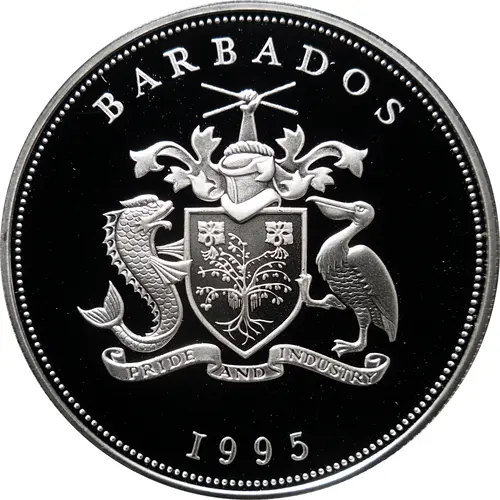 | Reverse lettering | FIRST EUROPEAN SETTLEMENT OF BARBADOS 1625 FIVE DOLLARS |