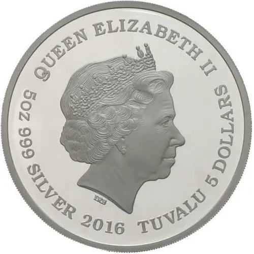 | Obverse lettering | QUEEN ELIZABETH II IRB 5oz 999 SILVER 2016 TUVALU 5 DOLLARS |
