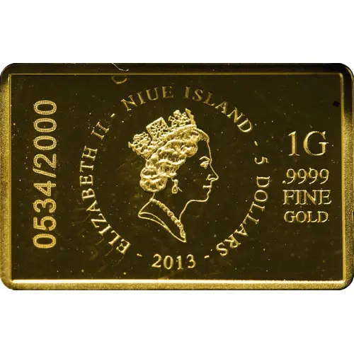 | Obverse lettering | ELIZABETH II - NIUE ISLAND - 5 DOLLARS - 2013 - 1G .9999 FINE GOLD |
