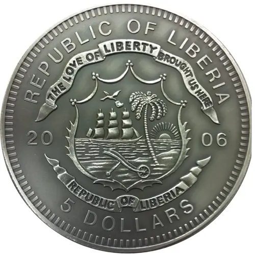 | Obverse lettering | REPUBLIC OF LIBERIA THE LOVE OF LIBERTY BROUGHT US HERE 2006 REPUBLIC OF LIBERIA 5 DOLLARS |