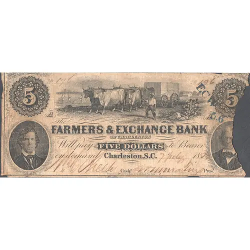 | Obverse lettering | No. 196 No. 196 5 5 The Farmers & Exchange Bank of Charleston Will pay FIVE DOLLARS to bearer on demand at Charleston, S.C. 7 July 18__ Toppan, Carpenter, Casilear Co. New York. |