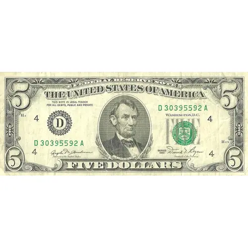 Portrait of Abraham Lincoln at center. Treasurer`s signature and Federal Reserve Bank Seal at left. Secretary`s signature and Treasury Seal to right. |