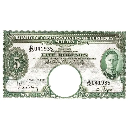 | Opis líce | Board of Commissioners of Currency Malaya This Note is Legal Tender for Five Dollars in the Straits Settlements and Malay States |