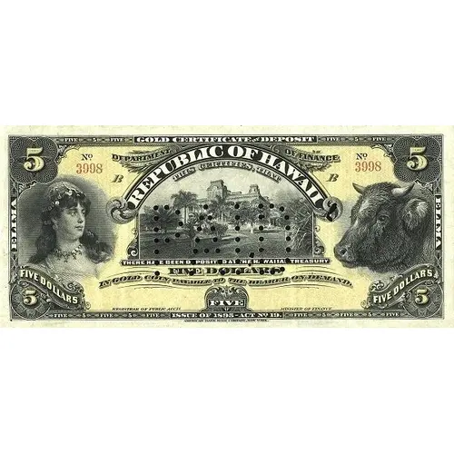 | Obverse lettering | GOLD CERTIFICATE OF DEPOSIT ELIMA DEPARTMENT OF FINANCE REPUBLIC OF HAWAII THIS CERTIFIES, THAT THERE HAVE BEEN DEPOSITED AT THE HAWAIIAN TREASURY FIVE DOLLARS IN GOLD COIN PAYABLE TO THE BEARER ON DEMAND FIVE ISSUE OF 1895 - ACT № 19 |