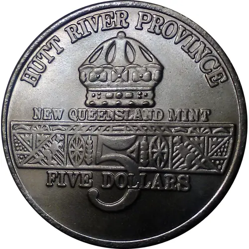 | Obverse lettering | HUTT RIVER PROVINCE NEW QUEENSLAND MINT 5 FIVE DOLLARS |
