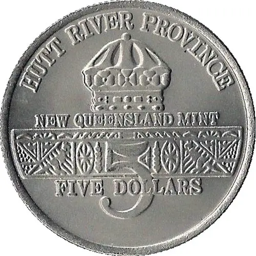 | Obverse lettering | HUTT RIVER PROVINCE NEW QUEENSLAND MINT FIVE DOLLARS 5 |