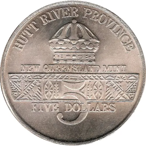 | Obverse lettering | HUTT RIVER PROVINCE NEW QUEENSLAND MINT FIVE 5 DOLLARS |