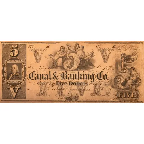 | Obverse lettering | The New Orleans Canal & Banking Co. Will pay Five Dollars on demand to ____________ or bearer. New Orleans _______________18____ |