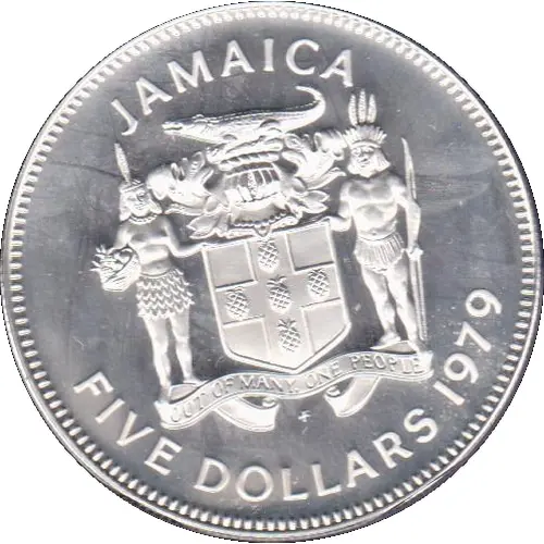 | Leyenda del anverso | JAMAICA FIVE DOLLARS 1979 OUT OF MANY ONE PEOPLE FM |