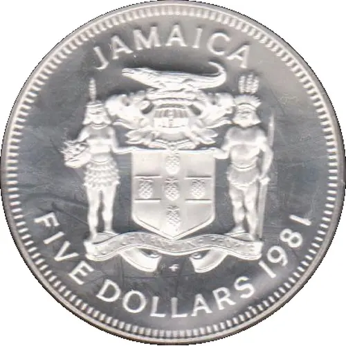 | Legenda awersu | JAMAICA FIVE DOLLARS 1981 OUT OF MANY, ONE PEOPLE FM |