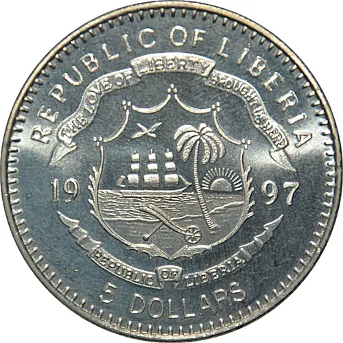 | Averslegende | REPUBLIC OF LIBERIA THE LOVE OF LIBERTY BROUGHT US HERE 1997 REPUBLIC OF LIBERIA 5 DOLLARS |