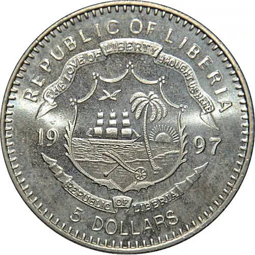 | Légende de l’avers | REPUBLIC OF LIBERIA THE LOVE OF LIBERTY BROUGHT US HERE 1997 REPUBLIC OF LIBERIA 5 DOLLARS |