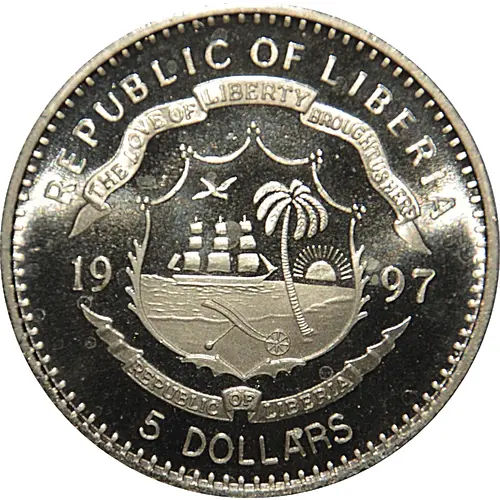 | Obverse lettering | REPUBLIC OF LIBERIA THE LOVE OF LIBERTY BROUGHT US HERE 1997 REPUBLIC OF LIBERIA 5 DOLLARS |