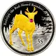 | Reverse description | Gilded Rudolph the rednosed reindeer, with a red ruby as nose, walking right, trees in the background. |