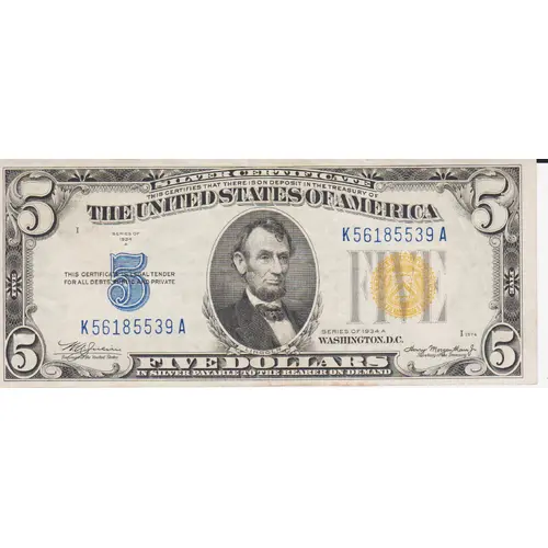 SILVER CERTIFICATE THIS CERTIFIES THERE IS ON DEPOSIT IN THE TREASURY OF THE UNITED STATES OF AMERICA THIS CERTIFICATE IS LEGAL TENDER FOR ALL DEBTS PUBLIC AND PRIVATE FIVE DOLLARS IN SILVER PAYABLE TO THE BEARER ON DEMAND |