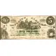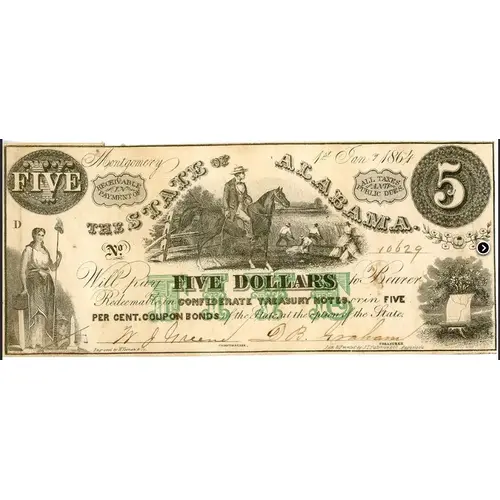 Montgomery 1st Jan, 1864 THE STATE OF ALABAMA Scene No. (serial number) Will pay FIVE DOLLARS to the Bearer Redeemable in CONFEDERATE TREASURY NOTES, or in FIVE PER CENT. COUPON BONDS of the State, at the option of the State. (Signature of Comptroller) (Signature of Treasurer) (Translation: N/A, written in English) |