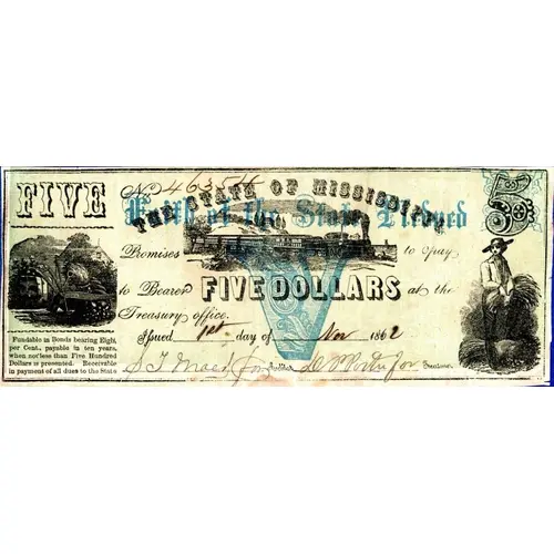 | Obverse lettering | FIVE, Fundable in Bonds bearing Eight Per cent, payable in ten years, when not less than Five Hundred Dollars is presented. Receivable in payment off all dues to the State. THE STATE OF MISSISSIPPI promises to pay to Bearer FIVE DOLLARS at the Treasury office. Issued ___________ day of ______________ 186 |