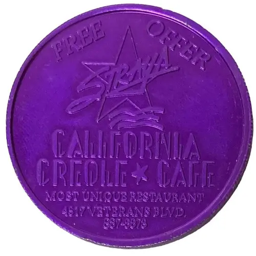 | Obverse lettering | FREE OFFER STRAyA CALIFORNIA CREOLE⭑ CAFE MOST UNIQUE RESTAURANT 4517 VETERANS BLVD. 887-8873 |