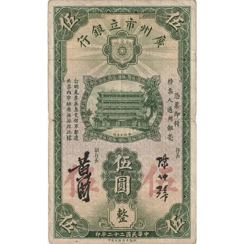 伍 行銀立市州廣 伍 失 訂 圓伍圓伍 票 明 伍——伍 內 見 圓——圓 持 字 票 伍——伍 票慿 跡 無 圓——圓 人票 原 息 伍——伍 通即 無 支 圓——圓 用付 添 付 伍——伍 銀 改 不 圓——圓 亳 此 湳 伍——伍 據 遺 圓伍圓伍 副 伍 行 行 圓 長 長 整 伍 印年二十二國民華中 伍 (Translation: Five Canton Municipal Bank Five This banknote ensures that payment is made on demand without interest and is not subject to change. The writing on the banknote is authentic and there are no alterations made to it. Pay on demand. Could be trade with silver coins. Issued in the 22nd year of the Republic) |