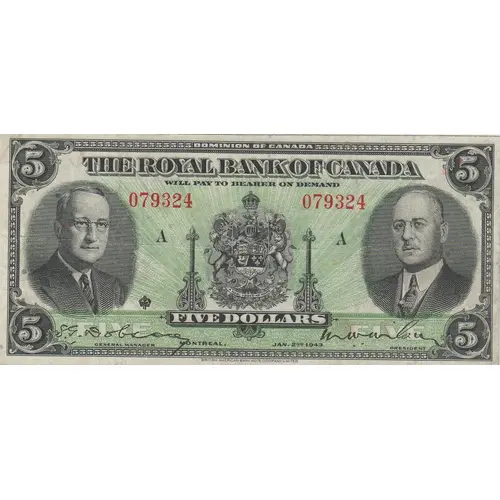 5 - 5 DOMINION OF CANADA THE ROYAL BANK OF CANADA WILL PAY TO BEARER ON DEMAND FIVE DOLLARS MONTREAL, JAN 2nd 1943. General Manager - President BRITISH AMERICAN BANK NOTE COMPANY LIMITED 5 - 5 |