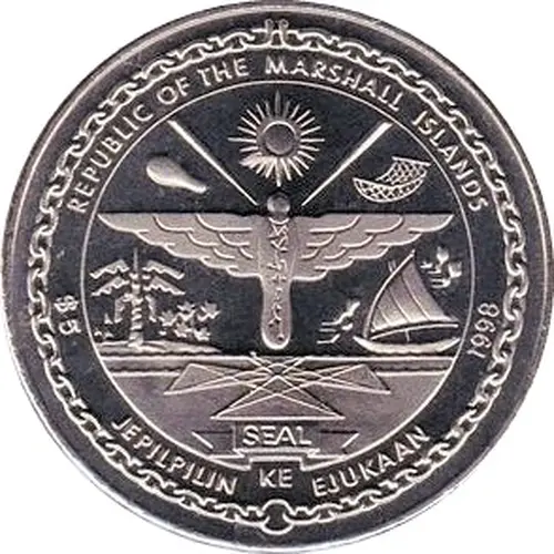 | Obverse lettering | REPUBLIC OF THE MARSHALL ISLANDS $5 JEPILPILIN KE EJUKAAN 1998 |