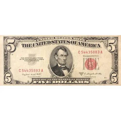 Portrait of Abraham Lincoln at center. Treasurer`s signature and 5 at left. Secretary`s signature and Treasury Seal to right. |