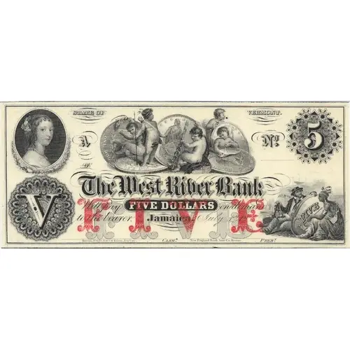 | Obverse lettering | STATE OF VERMONT The West River Bank Will pay FIVE DOLLARS on demand to the bearer Jamaica, July 1st 18____ CASH PRES Rawdon, Wright, Hatch & Edson, New-York New England Bank Note Co. Boston. |