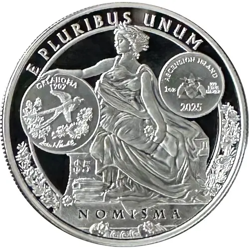 正面铭文 E PLURIBUS UNUM OKLAHOMA 1907 Susan Gamble ASCENSION ISLAND 1oz 999 FINE SILVER 2025 $5 JI NOMISMA