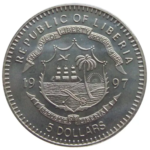 | Ön yüz lejandı | REPUBLIC OF LIBERIA THE LOVE OF LIBERTY BROUGHT US HERE 1997 REPUBLIC OF LIBERIA 5 DOLLARS |