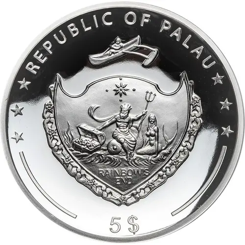 | Chữ khắc mặt trước | REPUBLIC OF PALAU RAINBOW`S END 5$ |