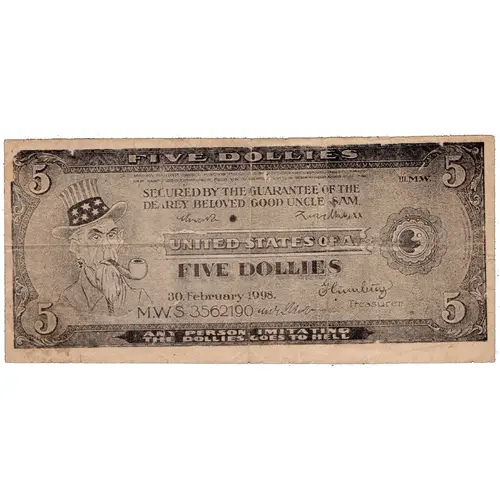 | Obverse lettering | FIVE DOLLIES SECURED BY THE GUARANTEE OF THE DEARLY BELOVED GOOD UNCLE SAM UNITED STATES OF A. FIVE DOLLIES 30. February 1998 M.W.S.3562190 ANY PERSON IMITATING THE DOLLIES GOES TO HELL |